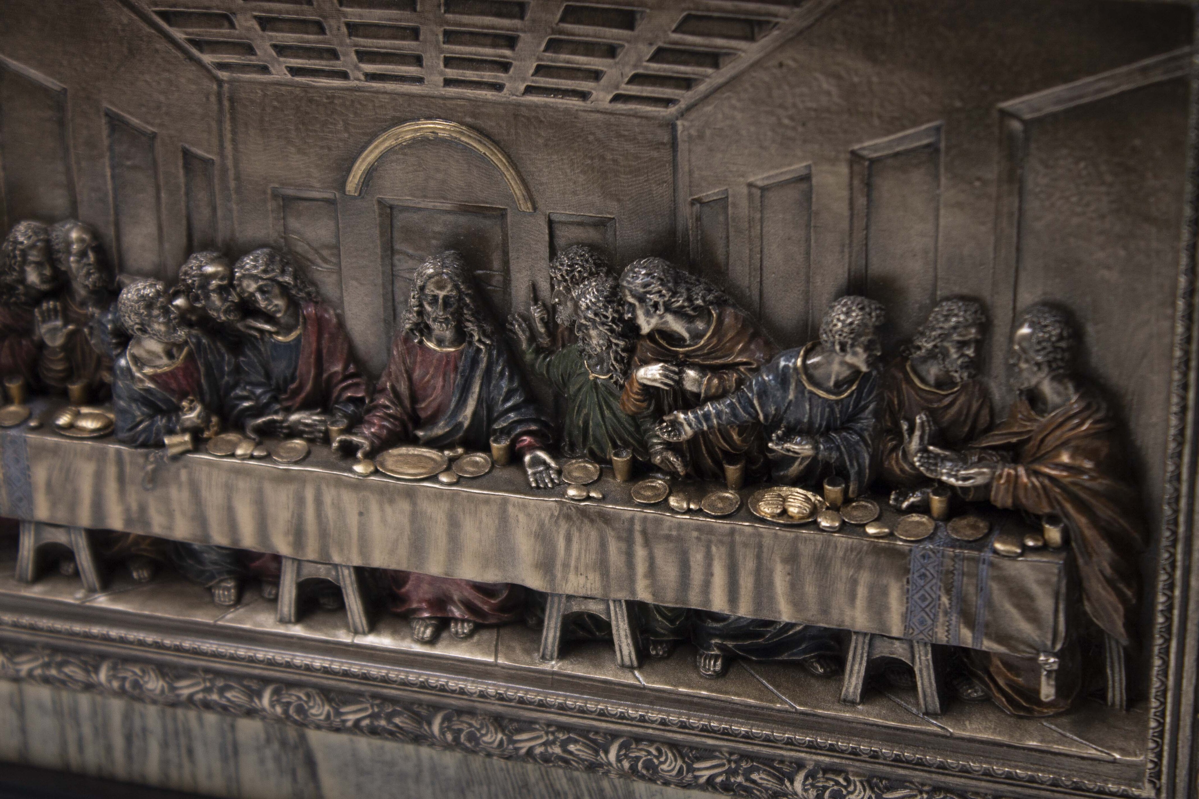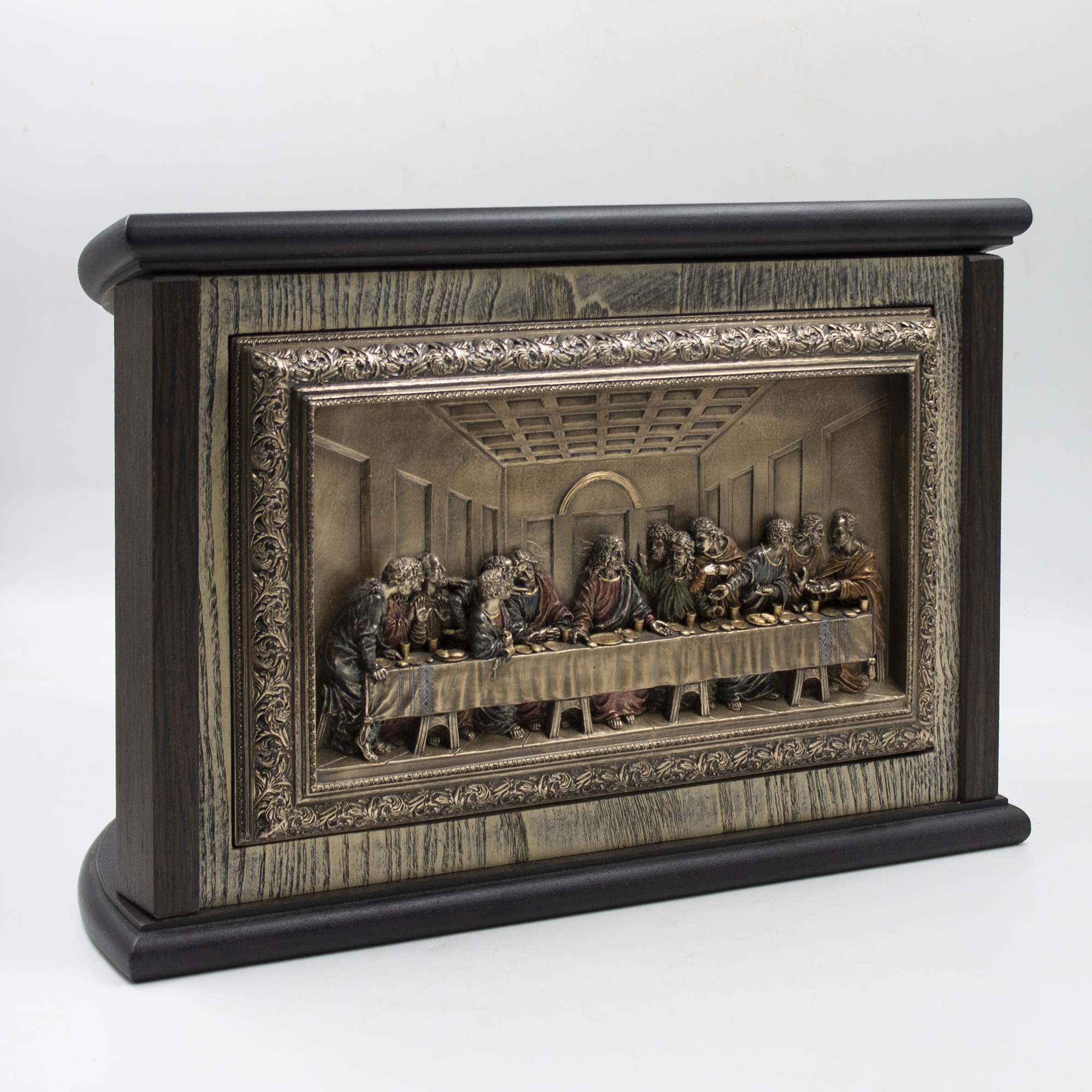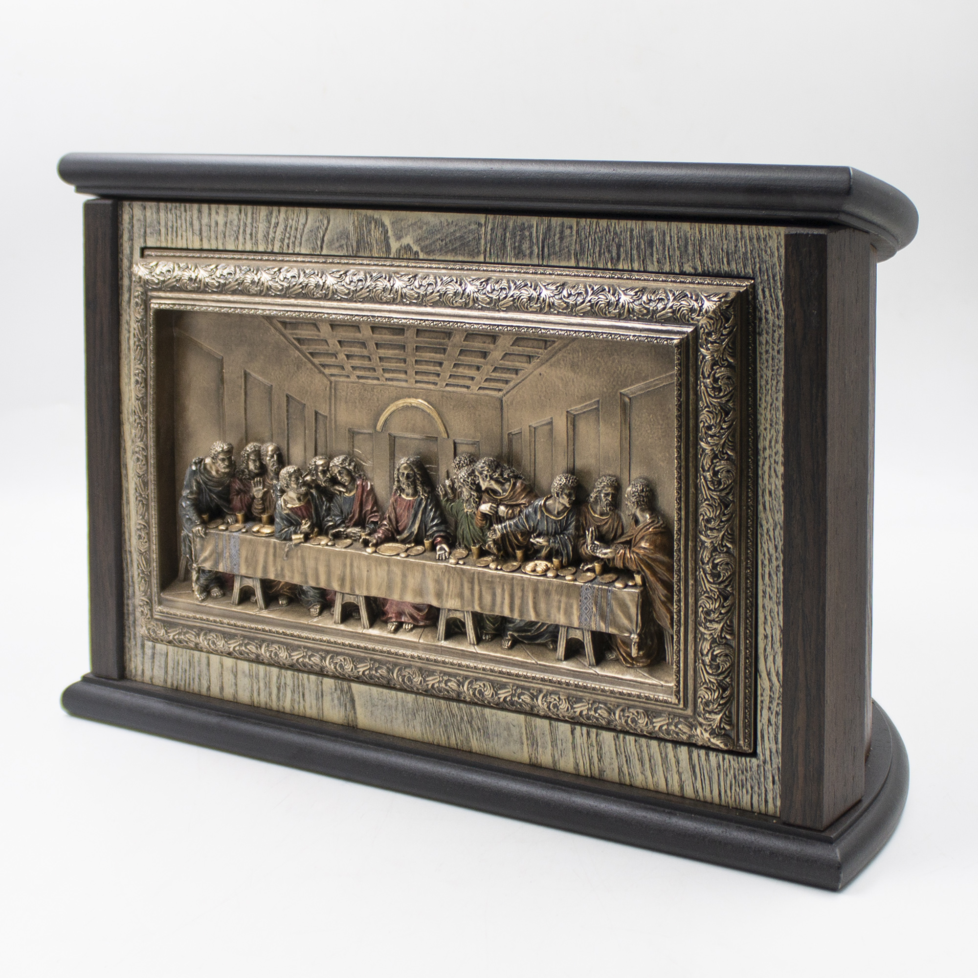 Авторская урна для праха в форме полу-колонны с инкрустированной иконой "Тайная Вечеря". Выбор для тех, кто ценит традиции и искусство. Оформление изделия подчеркивает духовность и изысканный вкус заказчика.