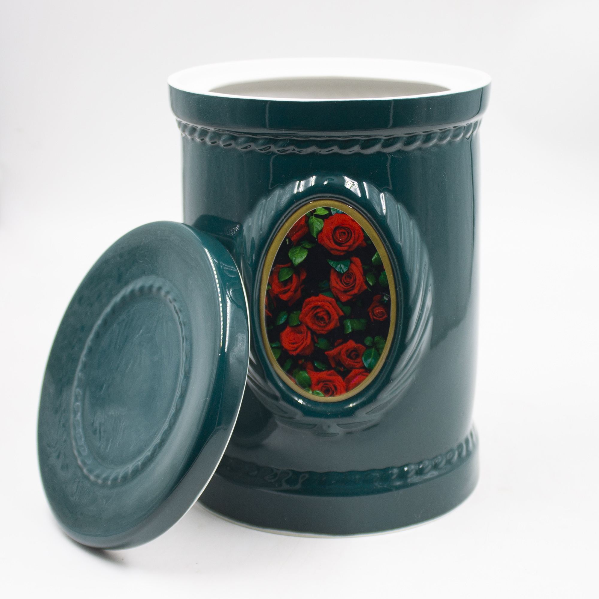 Погребальная урна традиционной цилиндрической формы из фарфора. Строгий темно-зеленый оттенок глазури сочетается с гладкой и глянцевой поверхностью, украшенной декоративными элементами. В обрамлении в центре урны расположена декоративная объемная наклейка из смолы. Различные тематики на выбор при заказе.