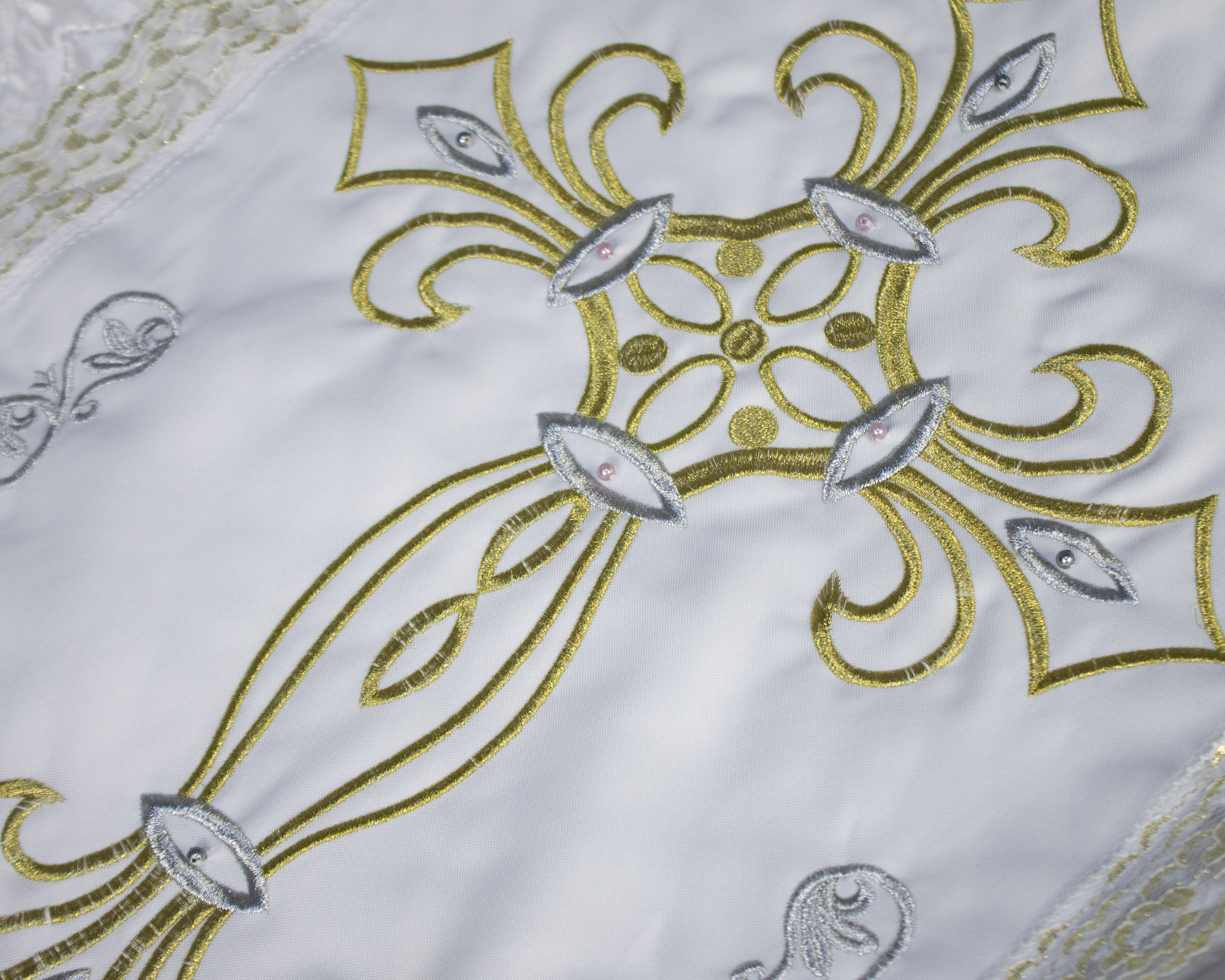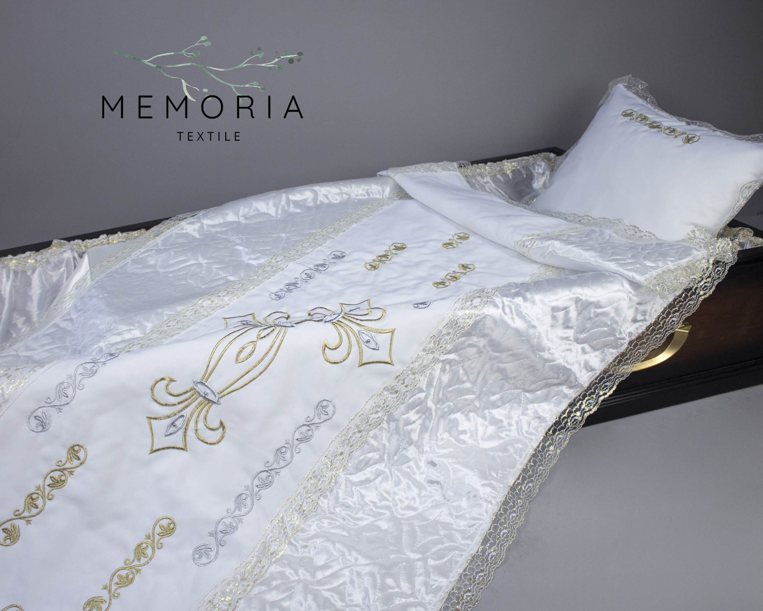 Комплект ритуальный с вышивкой из атласной стёжки и металлизированной золотой нити. В центре покрывала - вышитый «Крест Готика» на белом габардине. Обрамление золотым кружевом придает изысканный вид. Материал - атлас-стеганка. Уникальное сочетание качества и стиля.