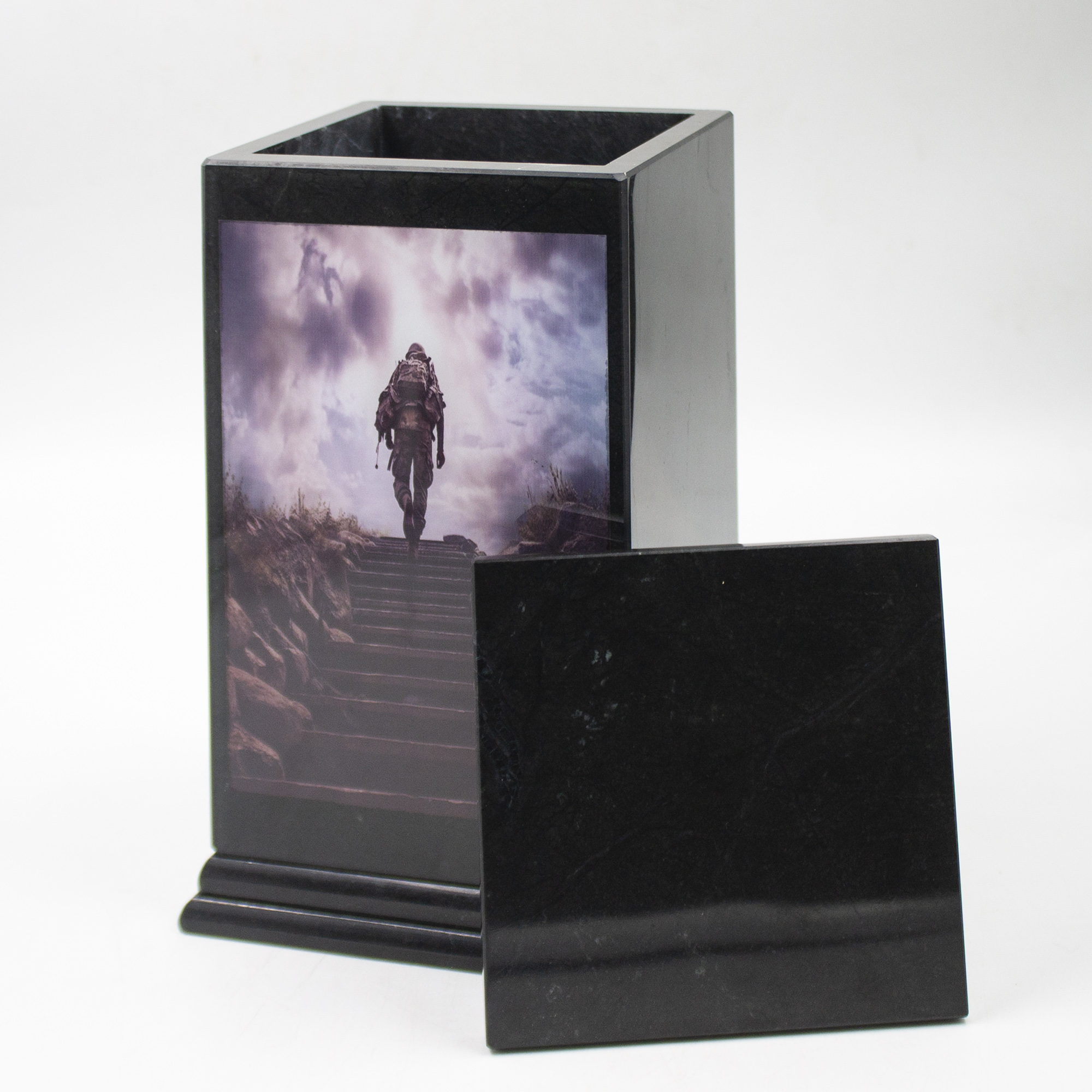 Урна для праха из природного доломита в форме обелиска, с полноцветной печатью.