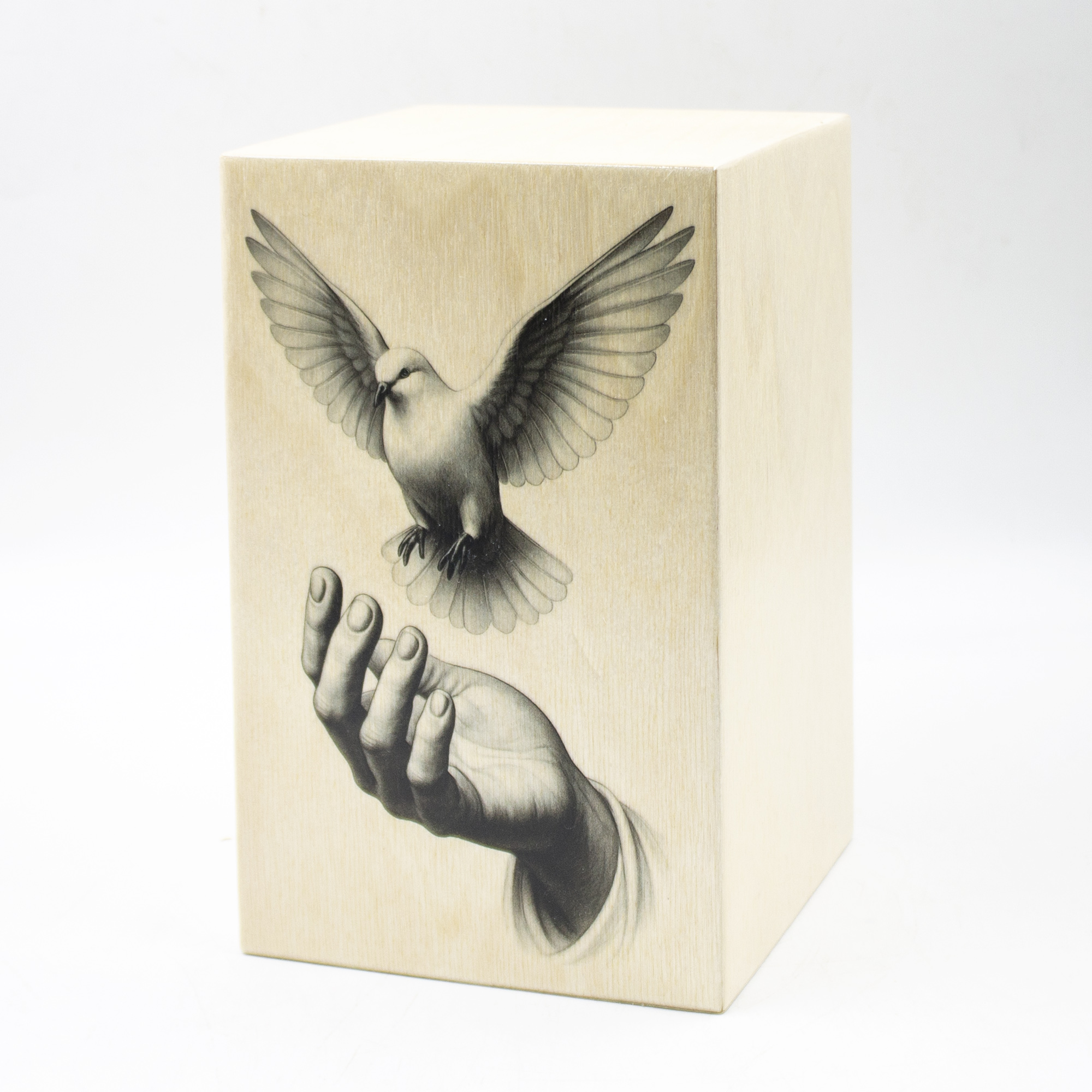 Урна для праха из натурального дерева в форме прямоугольной колонны с декоративной печатью "Голубь в руке".