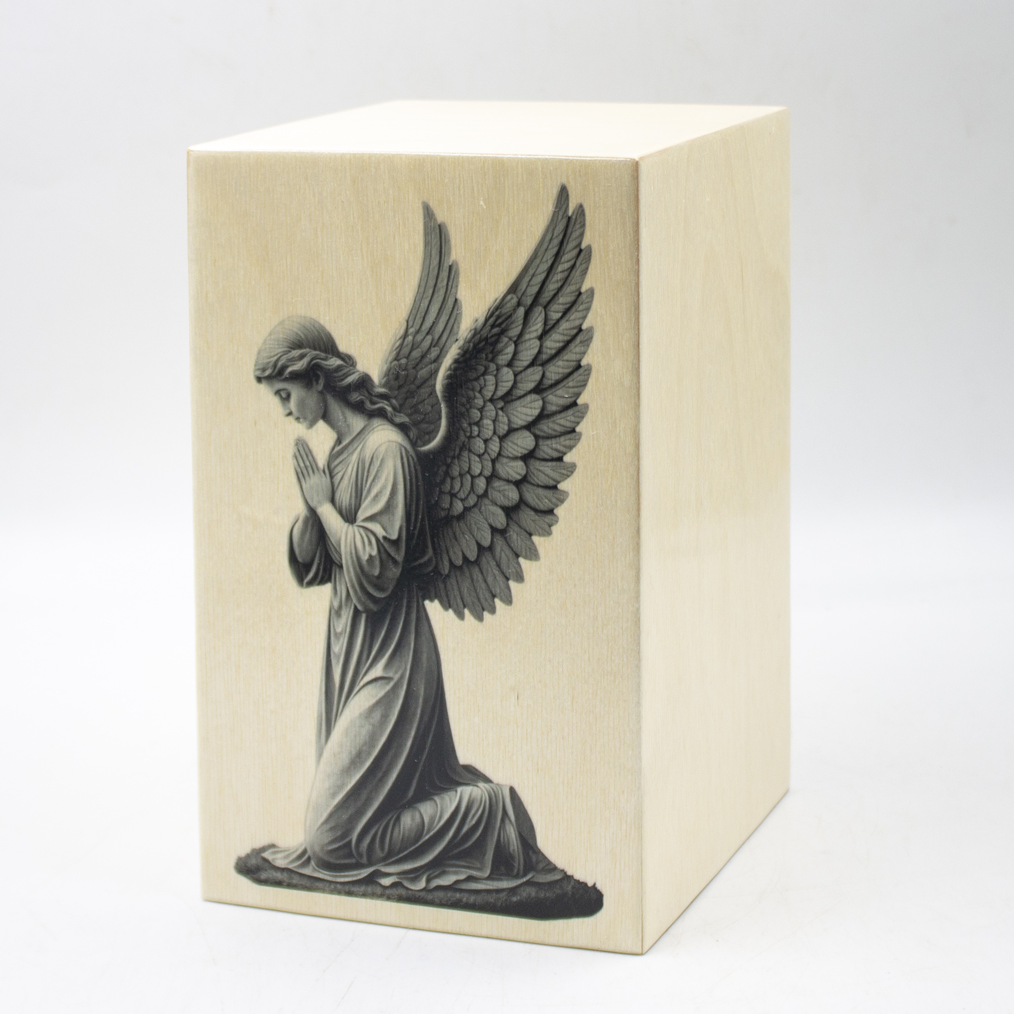 Урна для праха из натурального дерева в форме прямоугольной колонны с декоративной печатью "Ангел".