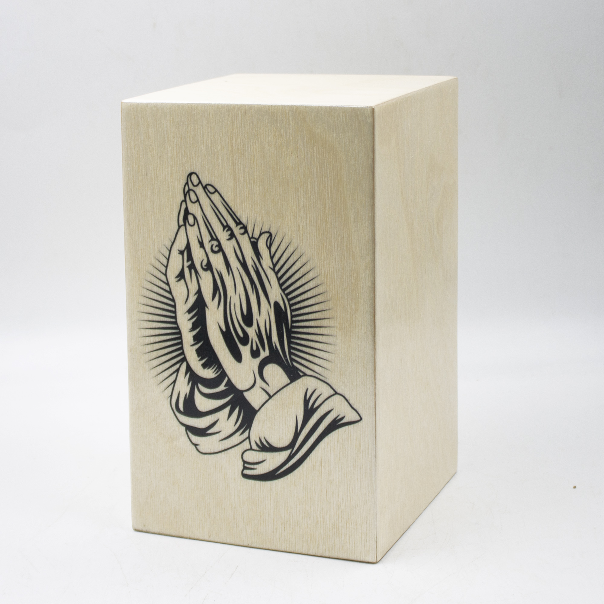 Урна для праха из натурального дерева в форме прямоугольной колонны с декоративной печатью "Молитва".