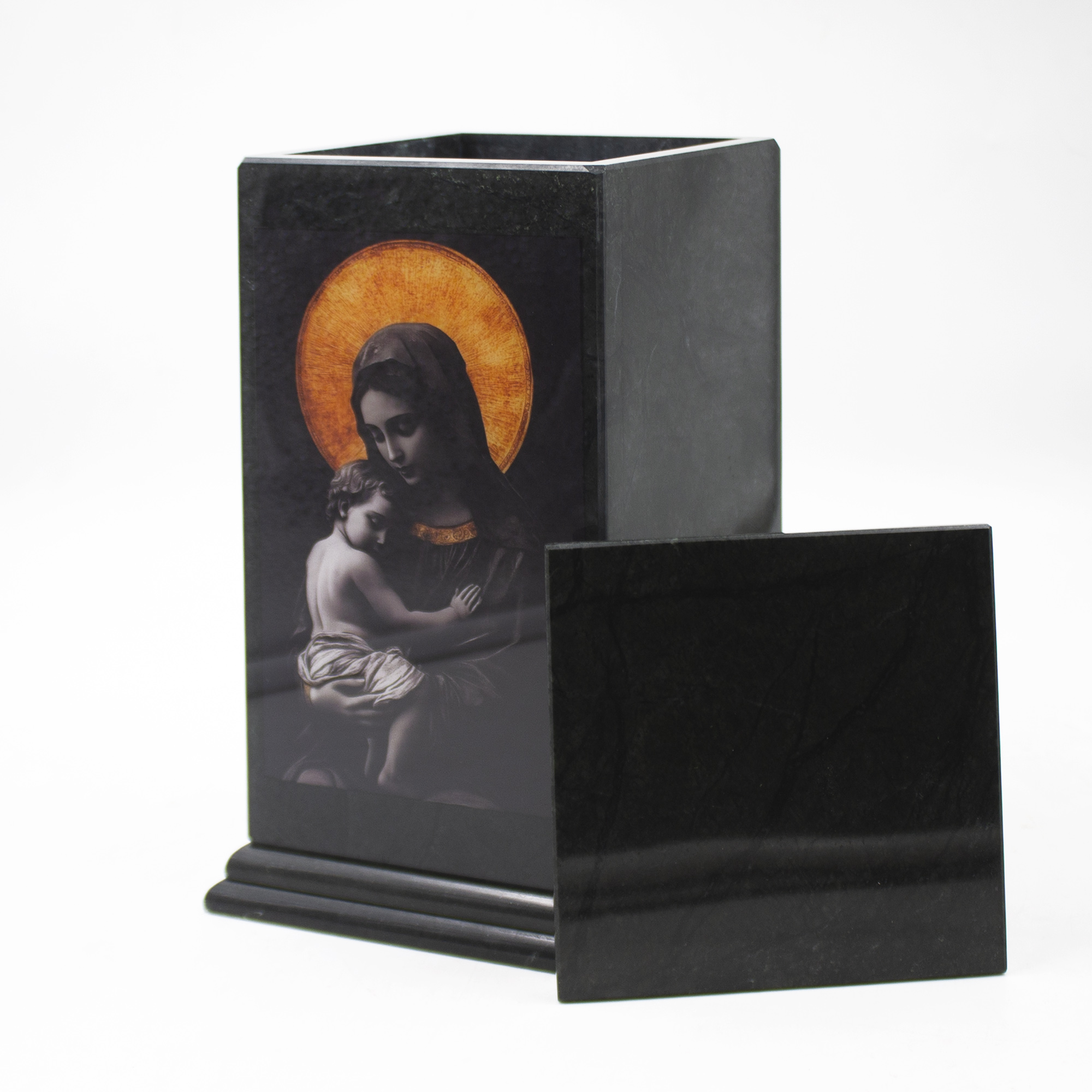 Погребальная урна с лаконичным дизайном и изяществом полированного доломита, с цветной печатью.