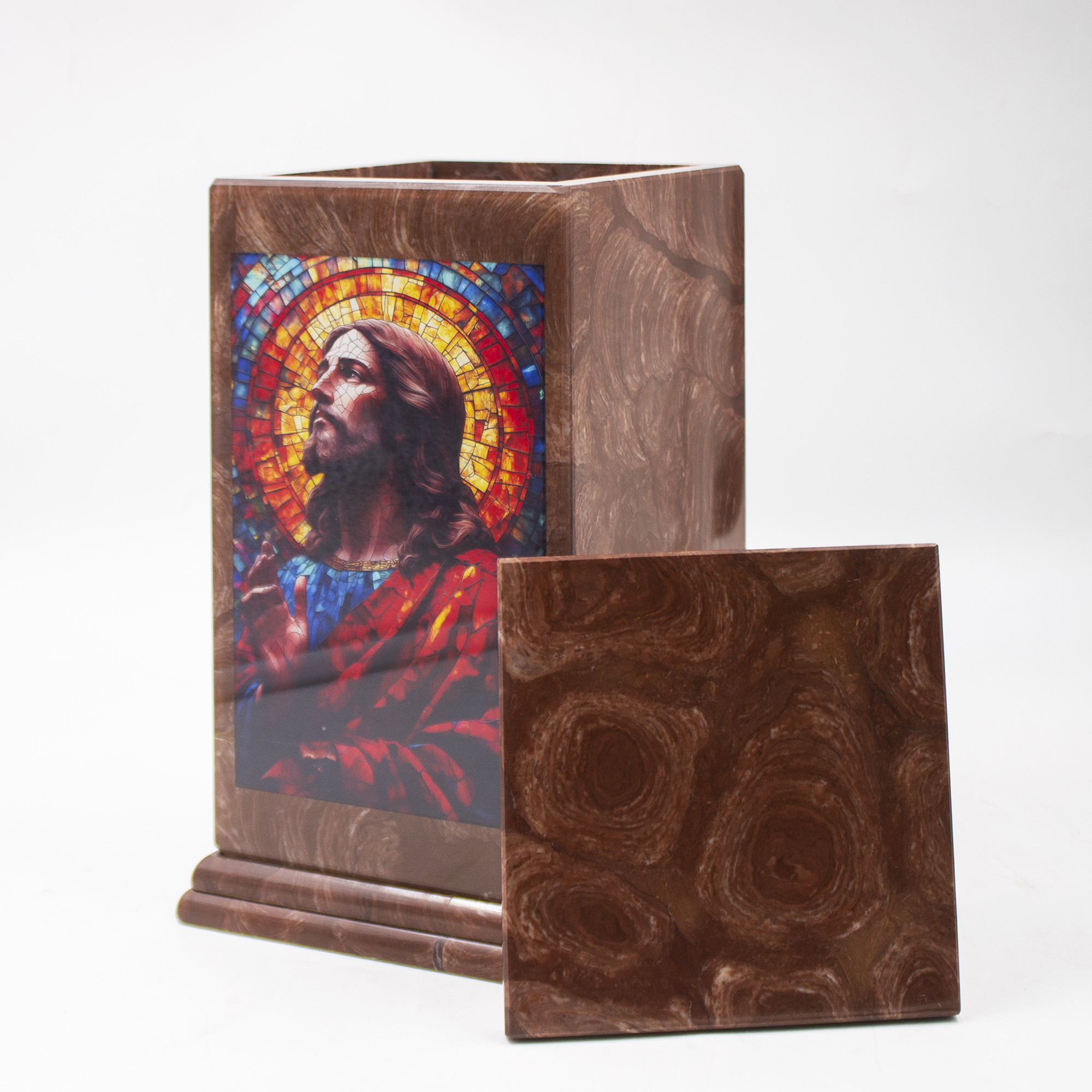 Погребальная урна с лаконичным дизайном и изяществом полированного креноида, с цветной печатью.