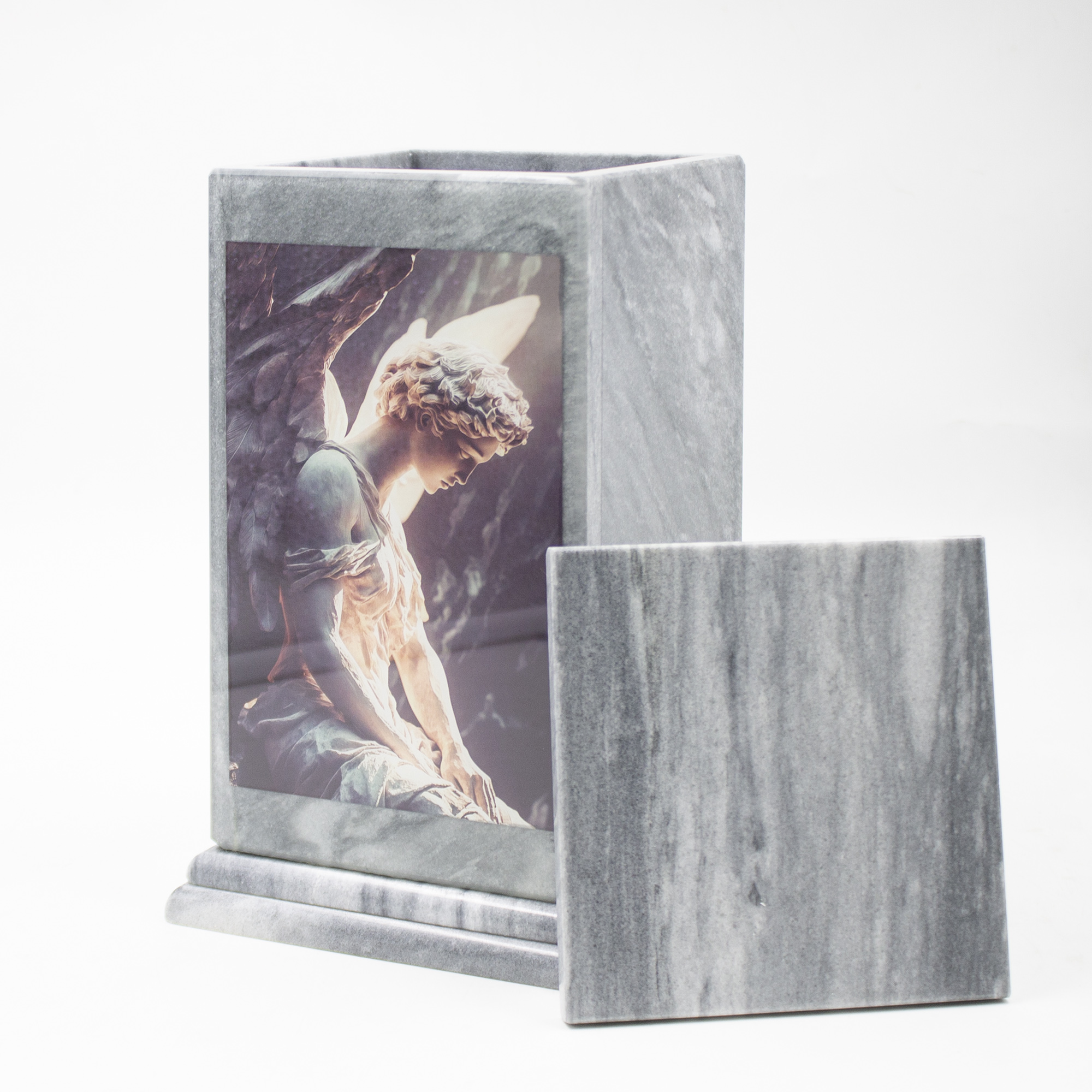 Погребальная урна с лаконичным дизайном и изяществом полированного серого мрамора, с цветной печатью.