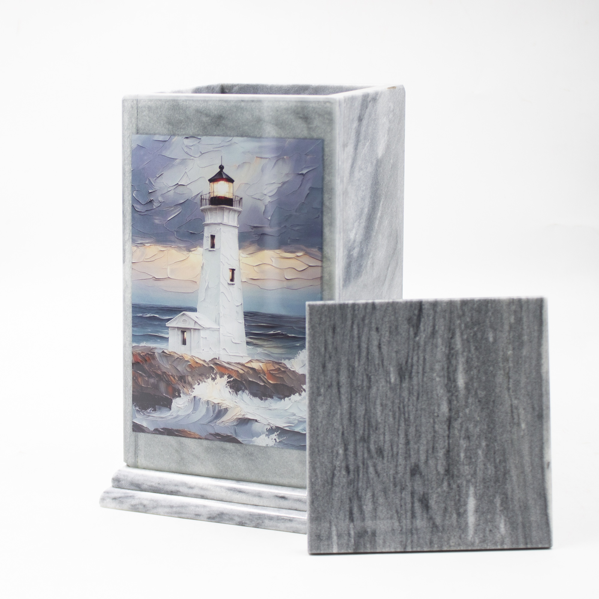 Погребальная урна с лаконичным дизайном и изяществом полированного серого мрамора, с цветной печатью.