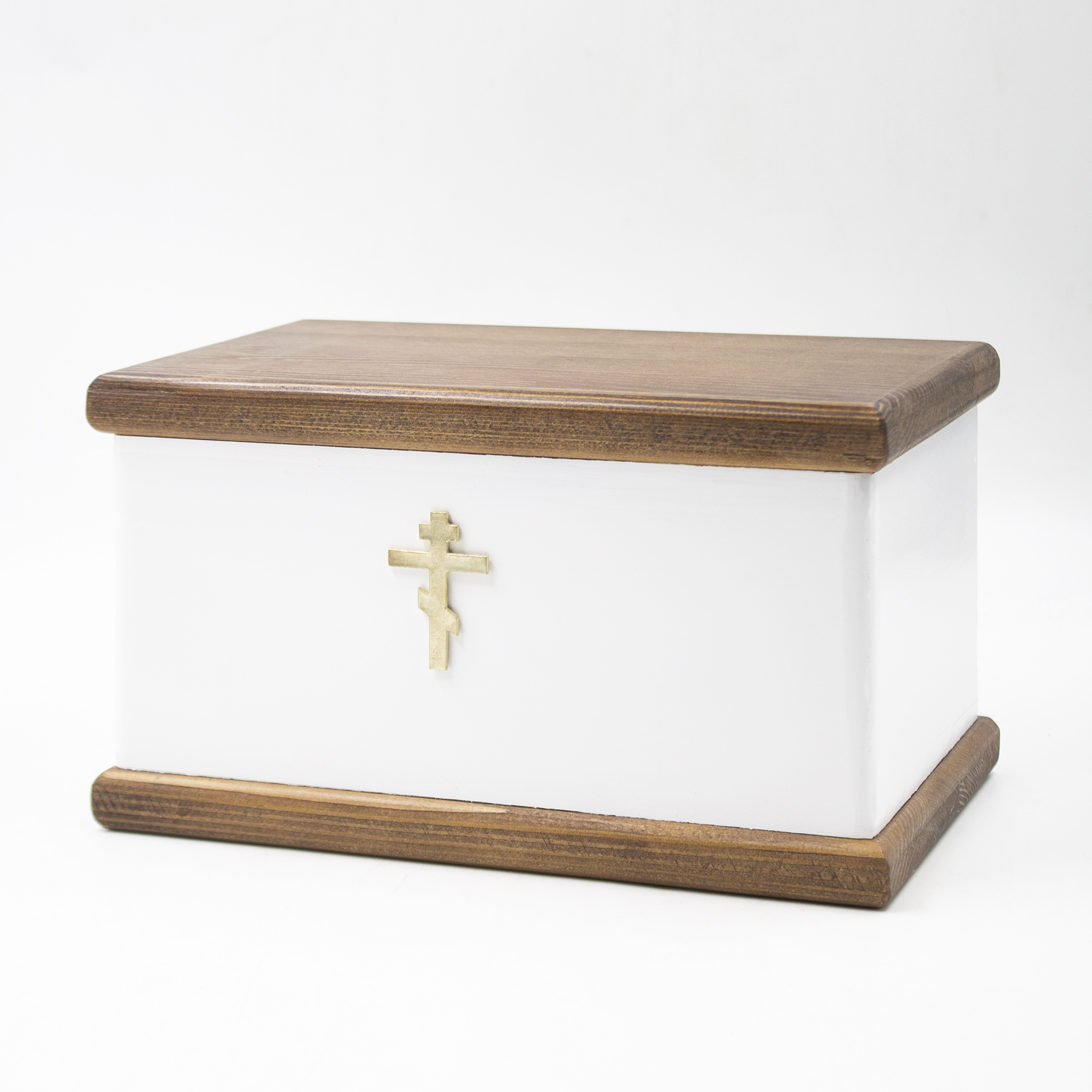 Урна для праха из натурального ясеня в форме прямоугольной шкатулки с бронзовым декором.