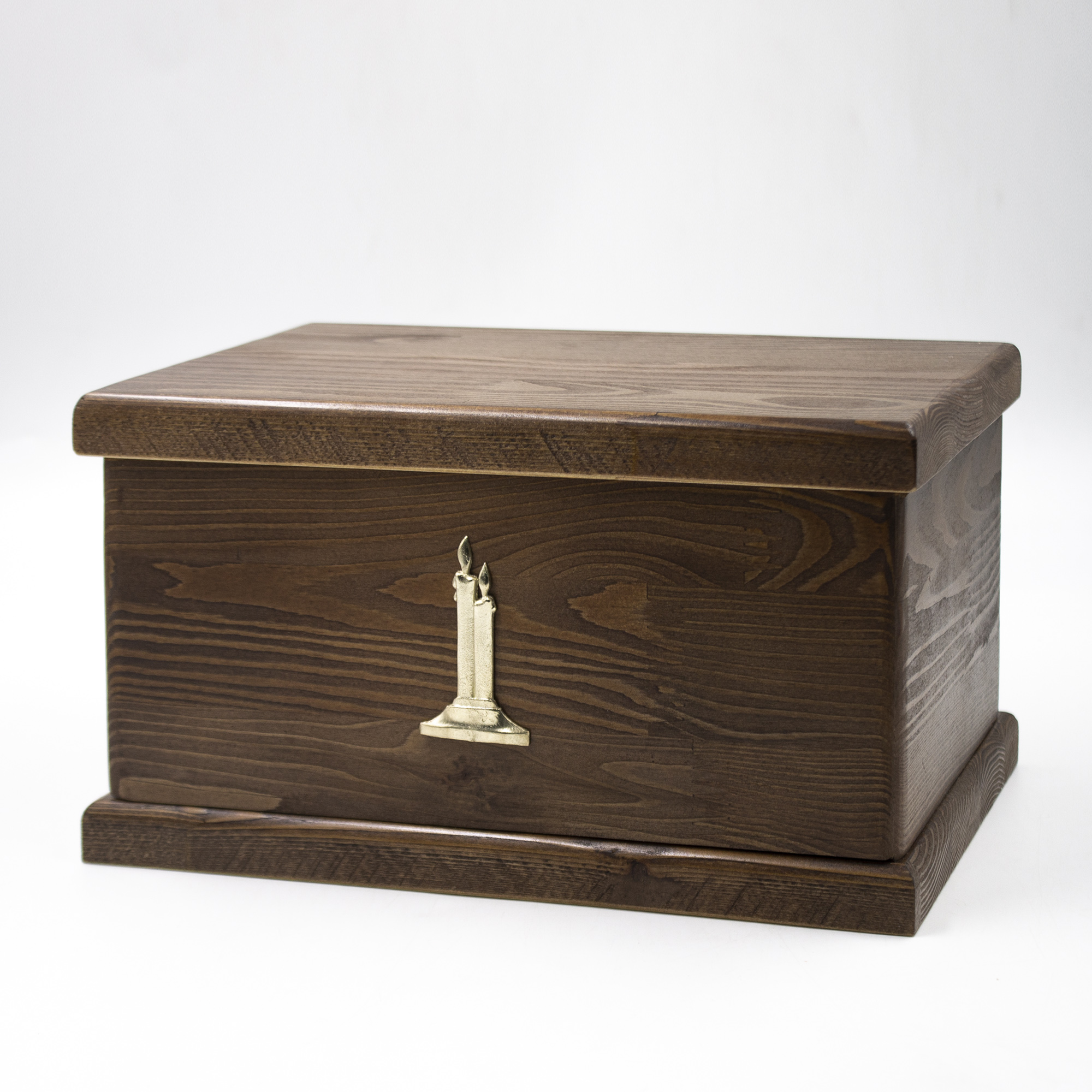 Урна для праха из натурального ясеня в форме прямоугольной шкатулки с бронзовым декором.