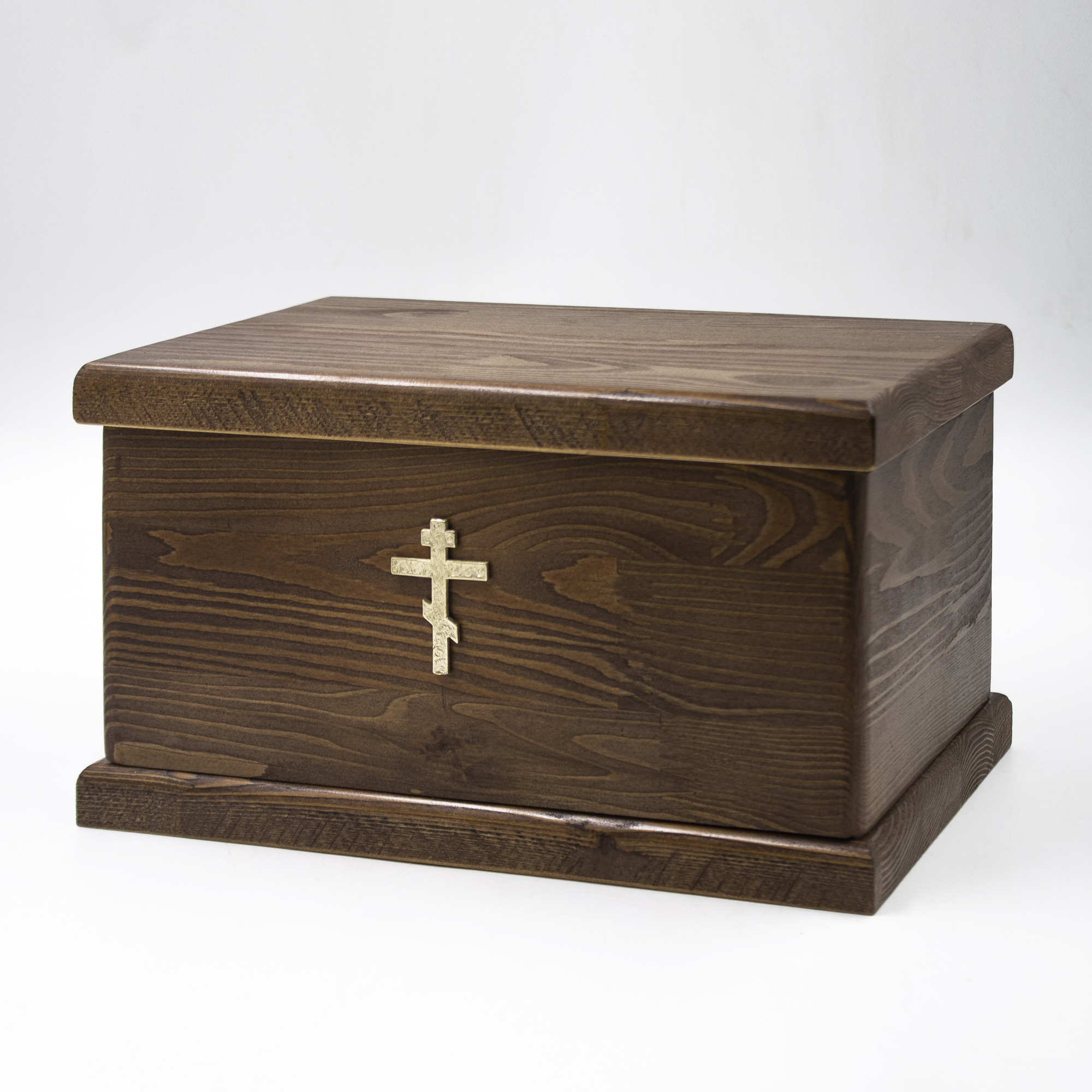 Урна для праха из натурального ясеня в форме прямоугольной шкатулки с бронзовым декором.
