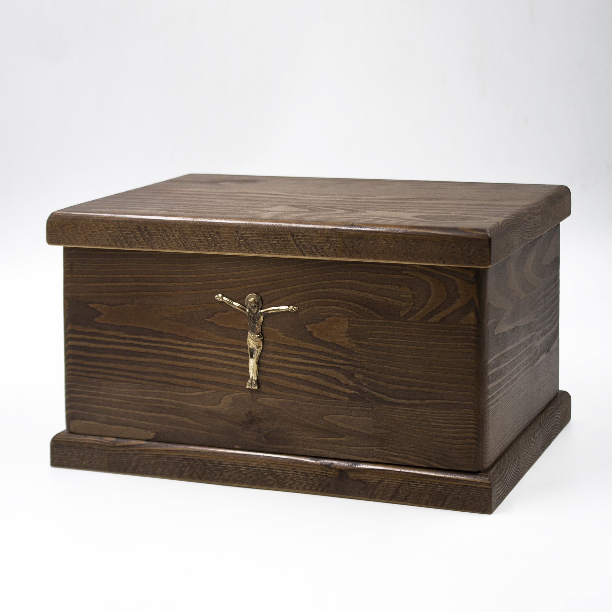 Урна для праха из натурального ясеня в форме прямоугольной шкатулки с бронзовым декором.