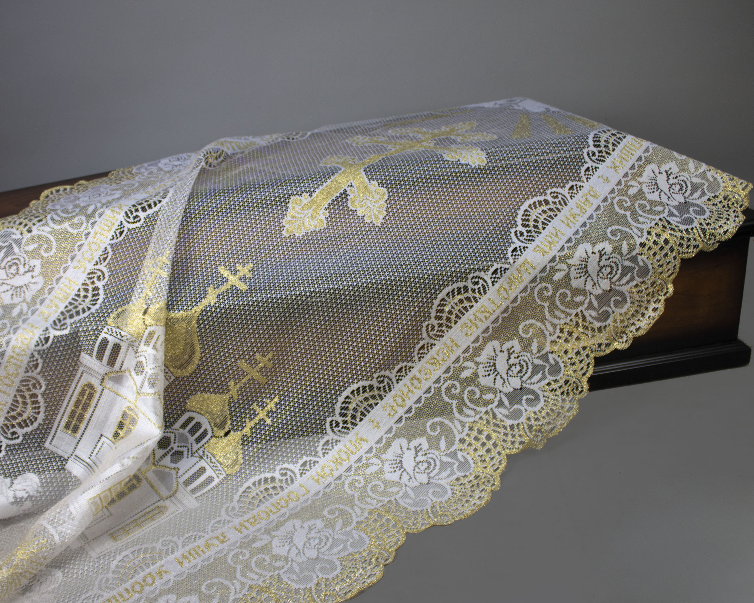 Покрывало церковное тюлевое с золотом, с узором "Церковь" и "Распятие".
